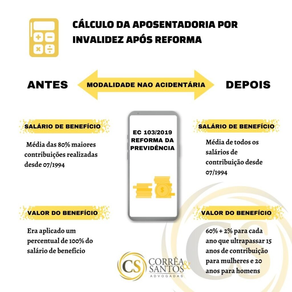 A Reforma da Previdência de 13/11/2019 teve mudanças no cálculo da aposentadoria por invalidez.